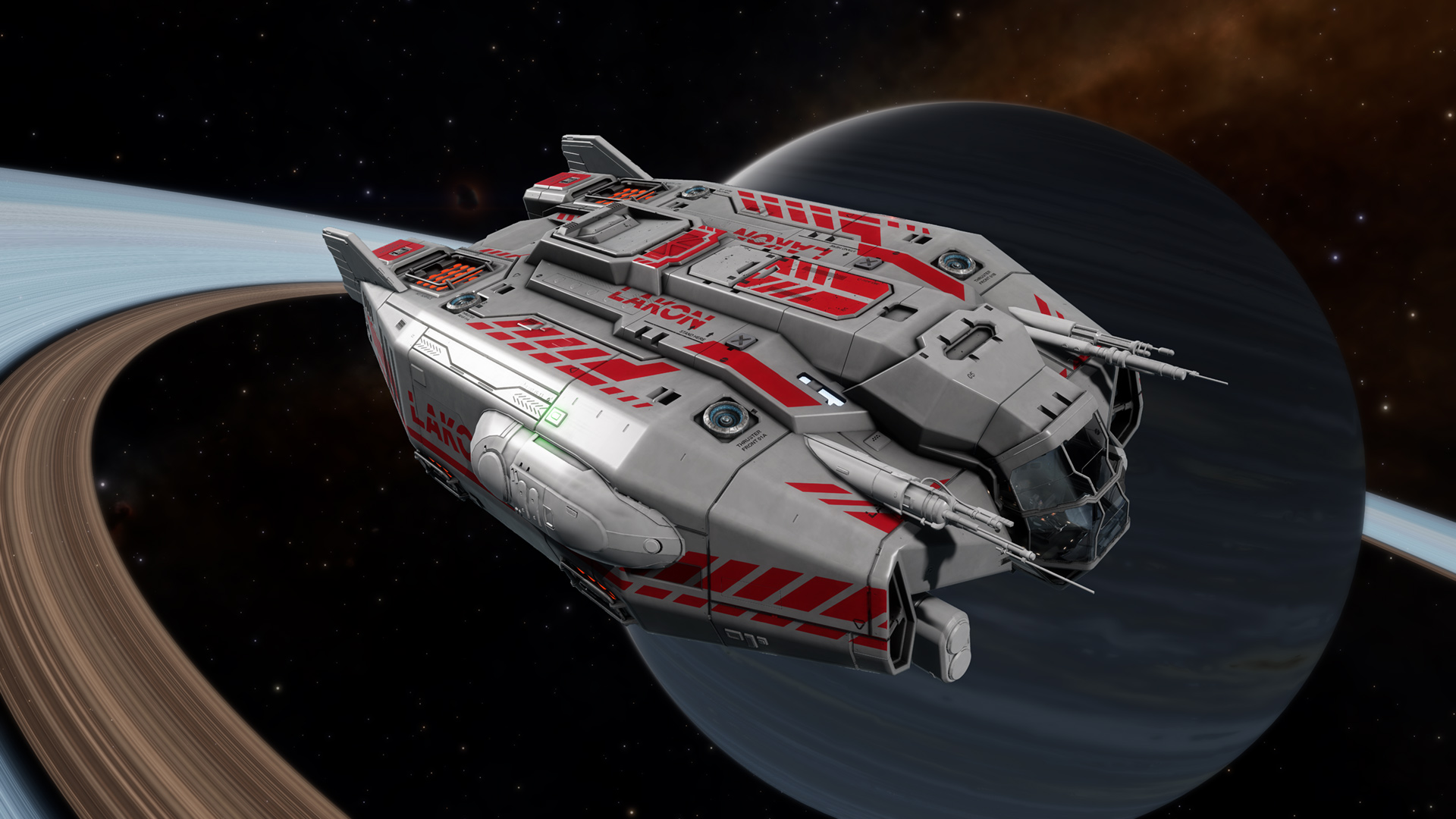 Manufactured by Lakon Spaceways, the Type-6 Transporter is seen by many independent pilots as a natural progression from the versatile Cobra Mk III. When appropriately outfitted, the ship offers sufficient cargo space for the profitable trading of standard commodities, precluding the need to transport rare commodities long distances. The Type-6 has limited combat ability, however, and pilots who expect conflict are advised to upgrade the ship's shields and hull.